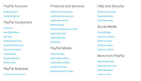 如今,有些設(shè)計(jì)師可能會(huì)認(rèn)為站點(diǎn)地圖是理所當(dāng)然的,但這仍然是向用戶提供定位的可靠方式。貝寶(PayPal)的站點(diǎn)地圖可能有太多鏈接,但是對(duì)于用戶來說,他們很難找到站點(diǎn)上所有內(nèi)容的位置以及如何瀏覽它,因此最好不要檢查站點(diǎn)地圖。