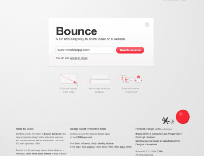 Zurb的?Bounce可以輕松在網(wǎng)站或圖像上共享想法。只需輸入U(xiǎn)RL(或上傳圖像文件),然后單擊并拖動(dòng)以做筆記。提供反饋后,您可以與任何人共享。