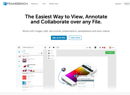Framebench適用于各種文件類型:圖像,電子表格,PDF,文檔,演示文稿和視頻。它包括組織工具,可讓您從客戶那里獲得反饋,并包括群聊。