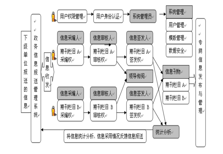 信息報送單位通過本系統(tǒng)實時報送政務(wù)信息,上級單位接收信息報送單位報送的各類信息進(jìn)行處理,信息采編人員通過本系統(tǒng)進(jìn)行信息采集、處理,完成刊物采編、發(fā)行、發(fā)布等過程。系統(tǒng)可以自動對各類信息的采用情況進(jìn)行匯總與統(tǒng)計。