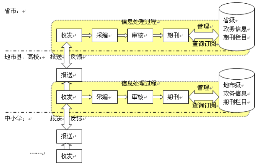 中小學(xué)信息報送單位作為客戶端登陸地市縣政務(wù)信息報送系統(tǒng),通過報送系統(tǒng)實時報送政務(wù)信息到地市縣;地市縣信息采編人員可以通過政務(wù)信息管理系統(tǒng)進(jìn)行政務(wù)信息采集、政務(wù)信息處理、刊物采編、刊物編輯、刊物發(fā)行等工作,并可以將信息轉(zhuǎn)送到省市;高等學(xué)校報送單位作為客戶端登陸省市政務(wù)信息報送系統(tǒng),通過報送系統(tǒng)實時報送政務(wù)信息到省市;省市信息采編人員通過政務(wù)信息管理系統(tǒng)進(jìn)行政務(wù)信息采集、政務(wù)信息處理、信息采編、信息刊發(fā)、信息發(fā)布等過程。
